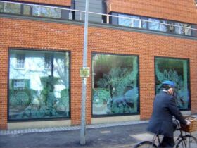 “Redeveloping our kitchens, buttery and related spaces gave us our first introduction to ‘Public Art’. We had to find an expert in architectural glass to transform ten huge picture windows along the Sidgwick Avenue frontage into works of art. The windows face north – they need to let in as much light as possible and to provide some degree of privacy for people using the Buttery while at the same time packing a real visual punch both for passers-by on the street and for those within the College.