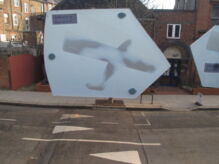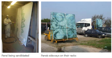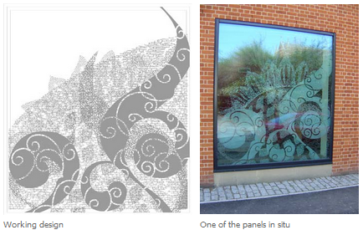 By combining both deep and shallow carving, with shading and textural effects on both sides of the 11mm glass, a dramatic effect was achieved with mercurial shadowing and 3D illusion. The artwork is lit to dramatic effect and so can be enjoyed by passers-by, night and day.