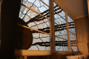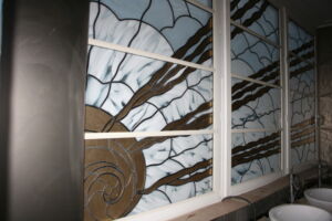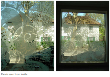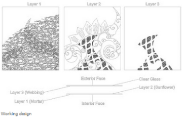 The design elements were sandblasted and carved on three sides of two pieces of glass, and then laminated together. These then formed into double-glazed units. By glazing alternate faces of the window, the blasted-brickwork curves create five arches which echo the Pfeiffer archway of the Pfeiffer Gates. The overlapping, multiple blasting creates magical shadow effects which provides an element of privacy for people inside and means they can peek out and view the elements.