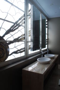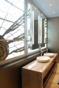 dynamic of movement. The windows draw one’s eye into the room, allowing the beauty of natural light to play on the panes and then upon the forms within the space to add still further to the grace of the room. The windows complete the space and contribute significantly to sustaining the aura of peace and stillness which has been created here.”